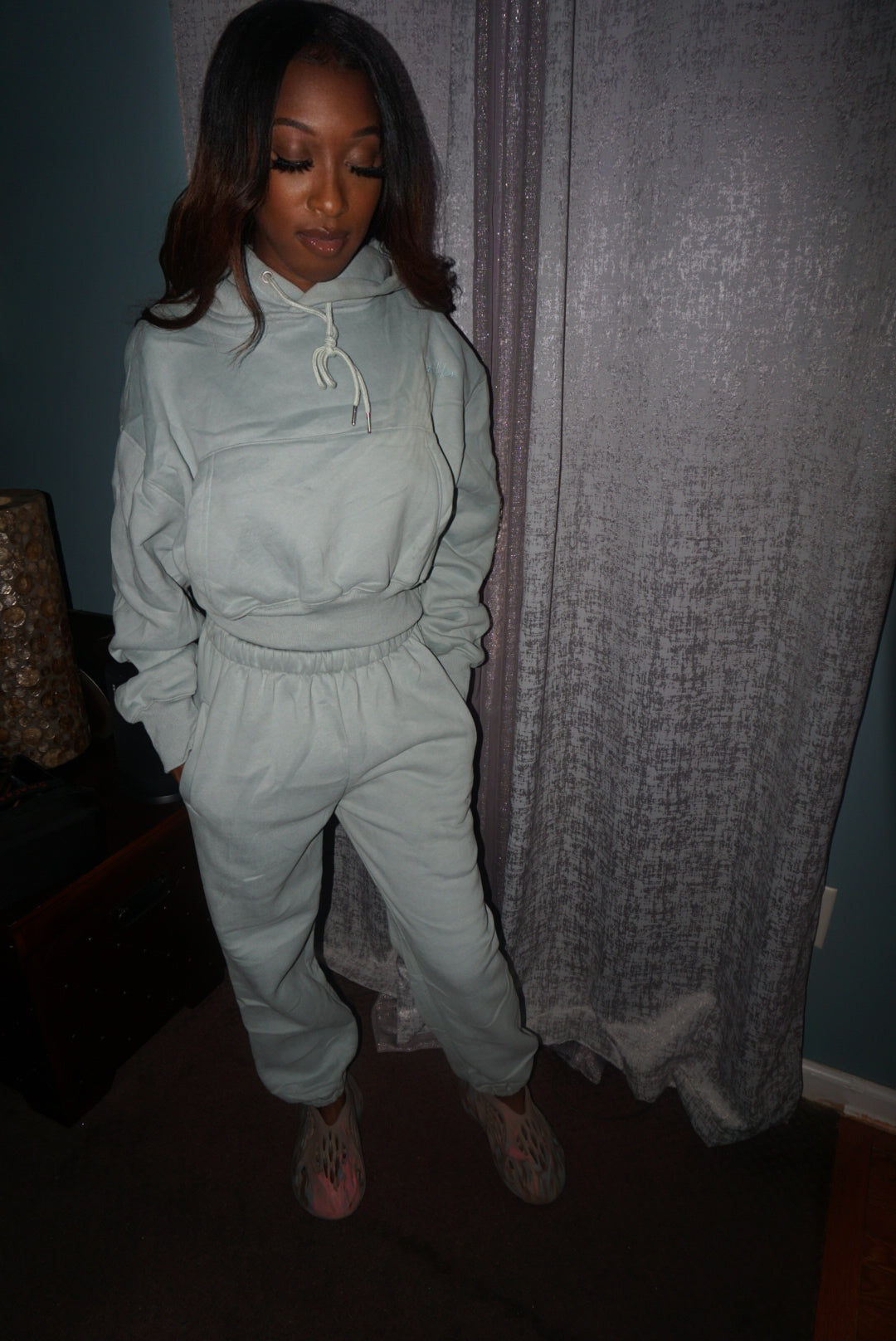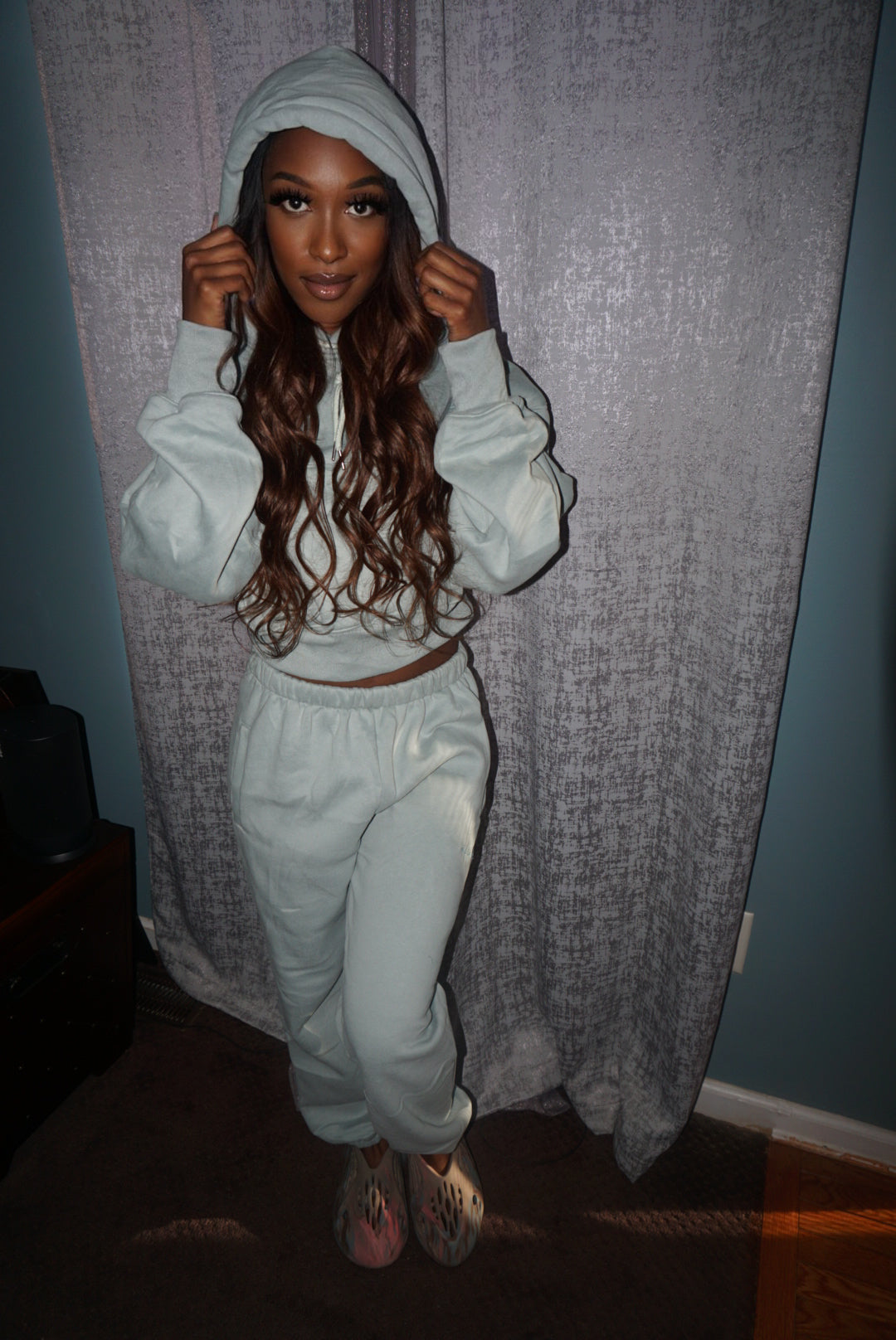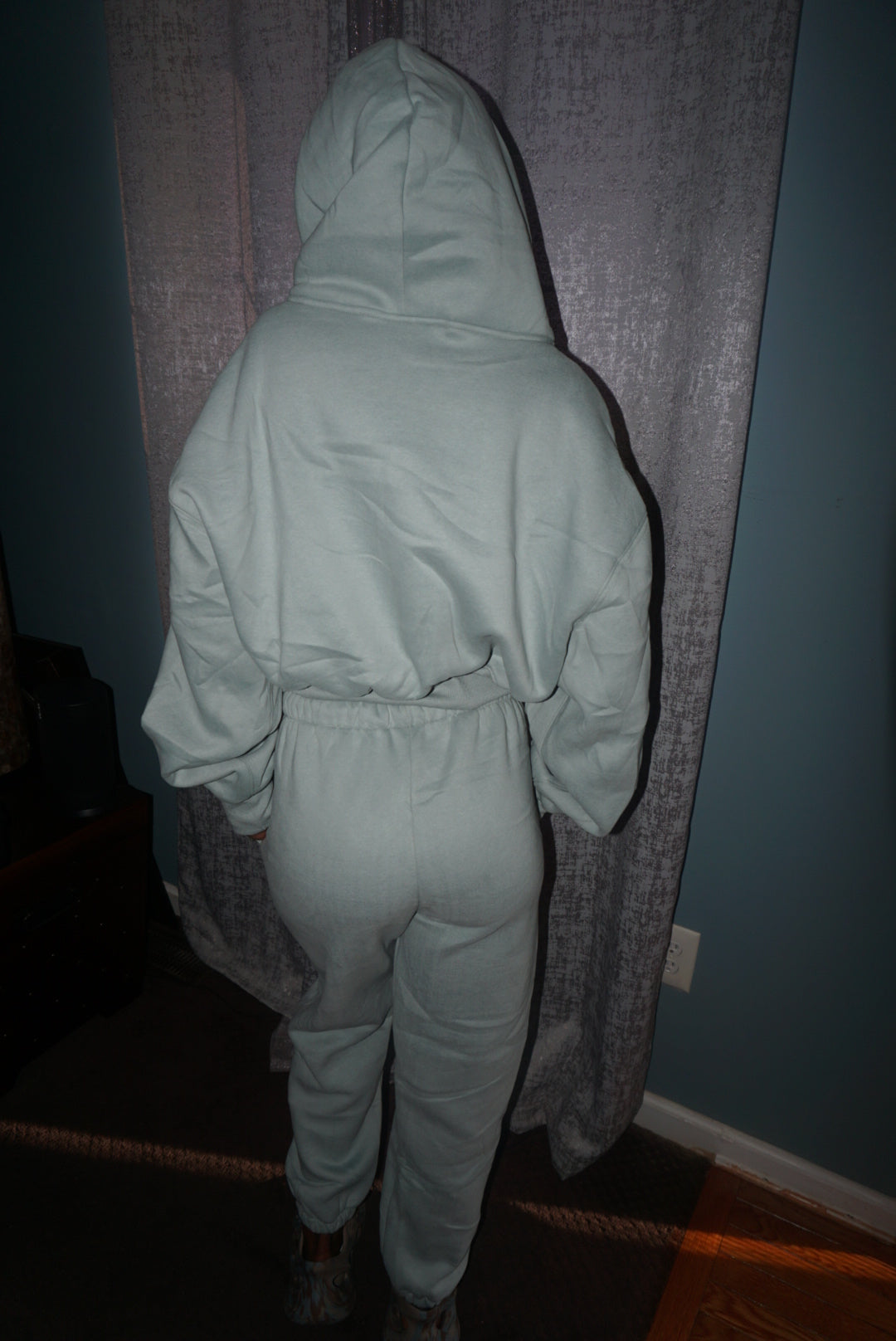 96% cotton. Hoodie and pants sold separately. Runs true to size. Model is wearing size small. Model is 5’5. Model in nude us wearing a size medium.